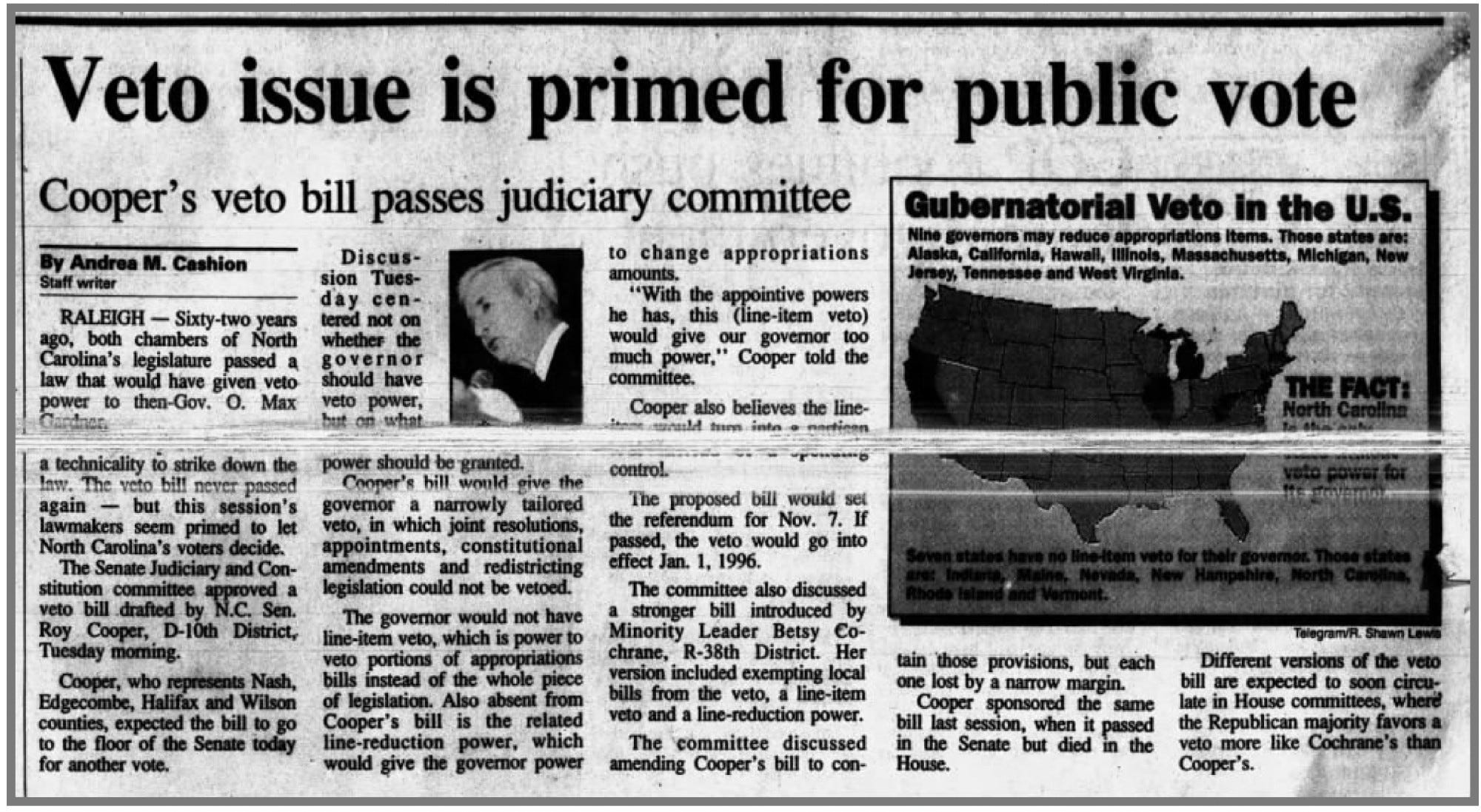 As the News and Observer’s Kyle Ingram noted, unlike many other states, the NC Governor doesn’t have the power to veto redistricting maps. That “narrowly tailored veto” was sponsored by none other than former Democratic Governor and current Senate candidate Roy Cooper (article from Rocky Mount Telegram from 1995 clipped ⤵️).3