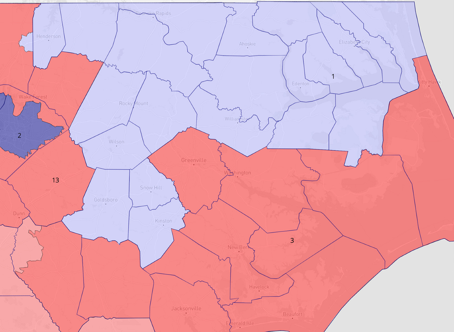Similarly, we have no way to know when the Callais decision will be released, but a recent New York Times analysis by Nate Cohen suggests it may not be until next summer. If that’s the case, we might expect *another* round of mid-decade redistricting after the 2026 election—although if NC-1 has already been altered, that 2026 redistricting may not affect North Carolina.