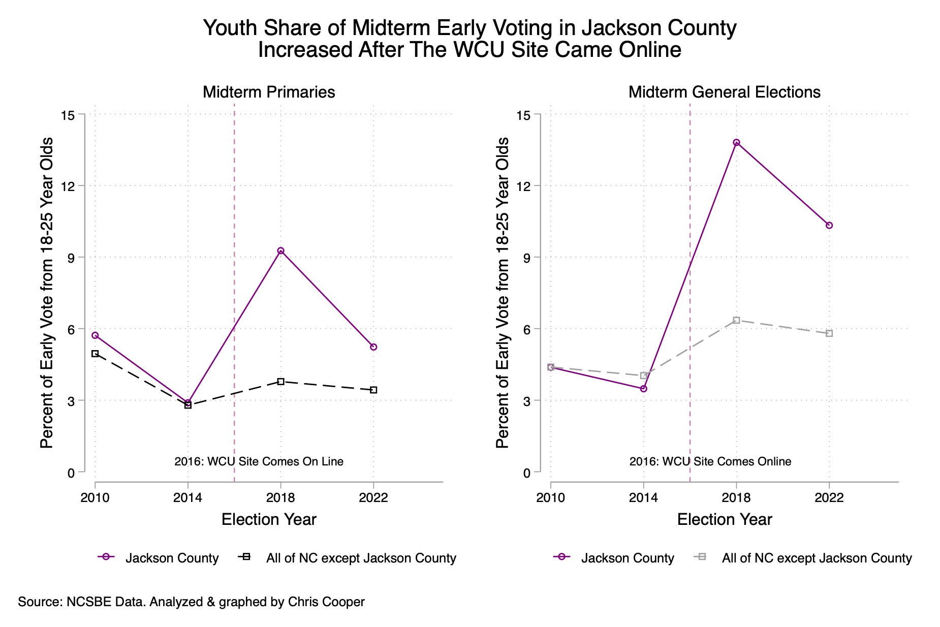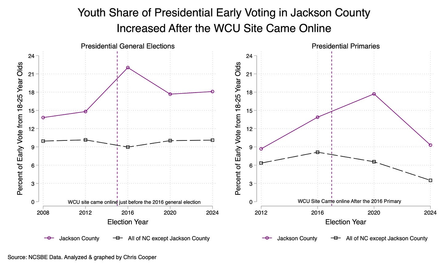 The Western Carolina University site increased youth early voting turnout. To understand the impact of the WCU site on voter turnout, I computed the percent of the Jackson County early voting electorate that was 18-25 years old in the nine elections beginning with the 2008 General election through the 2024 general election and then computed the same metric for the other 99 counties.