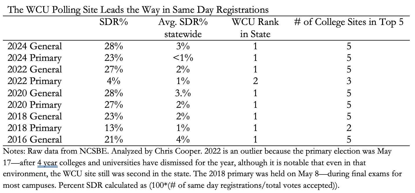 The Western Carolina University site increased same day registrations. As the table below illustrates, the early voting site at WCU had the highest proportion of same day registrations (SDRs) of any site in the state of North Carolina in eight out of the last nine elections. The sole exception to that rule was in the 2022 primary, where WCU had the second highest proportion of SDRs in the state.