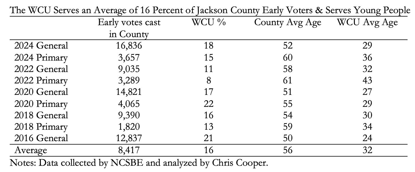 To learn more about the potential effects of such a change, I decided to see what the data and empirical literature can tell us about the performance of the WCU early voting site and what might happen if it is eliminated.4